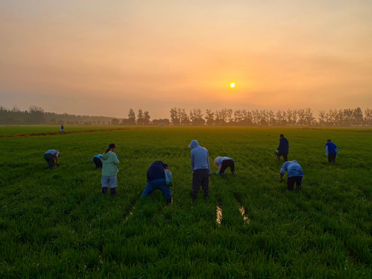 7月17日清晨5点多,天刚蒙蒙亮,大圹圩农场“千亩方”示范田里已是一片忙碌。农场近30名管理人员正在深一脚浅一脚地踩进水田,弯腰拔除自生稻。