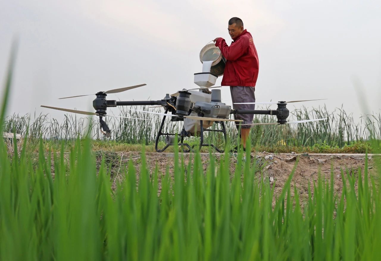7月30日,华阳河农场公司农科所示范田里,飞防手操作无人机开展水稻病虫害防控作业。